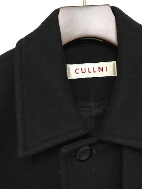 縮絨をしっかりとかけた光沢感と程よいハリコシのあるメルトンを使用。タイロッケンタイプに大きく配置したフラシ布が特徴。デザイン性の高いステンカラーコート。
