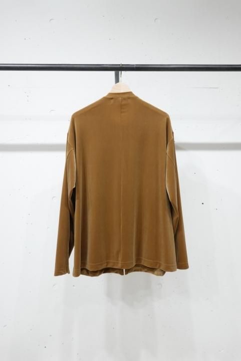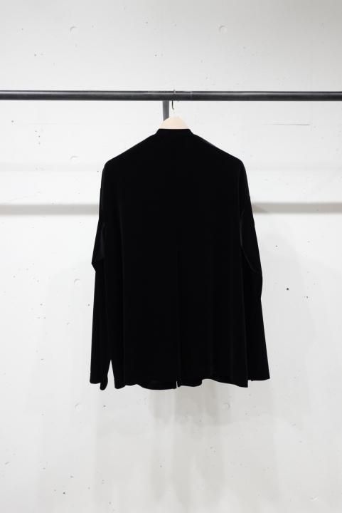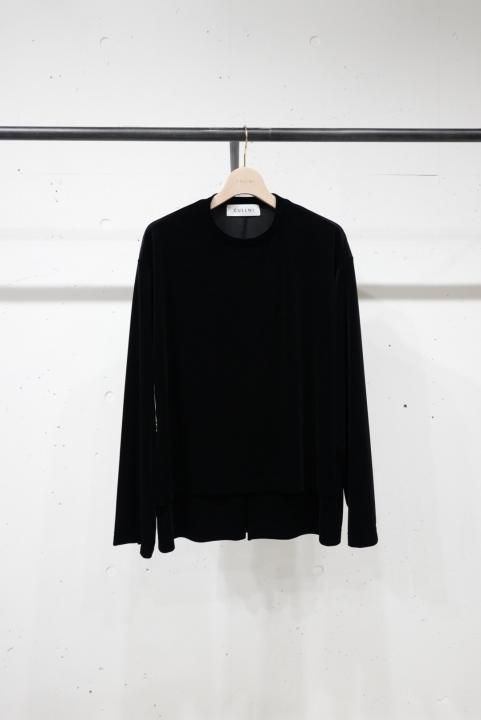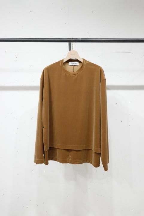 ベロアジャージーを使用しており、ふくらみ感と柔らかさが特徴的な風合いの素材です。インナー側にスリットの入ったレイヤードデザインで、両脇の金ボタンがポイント。