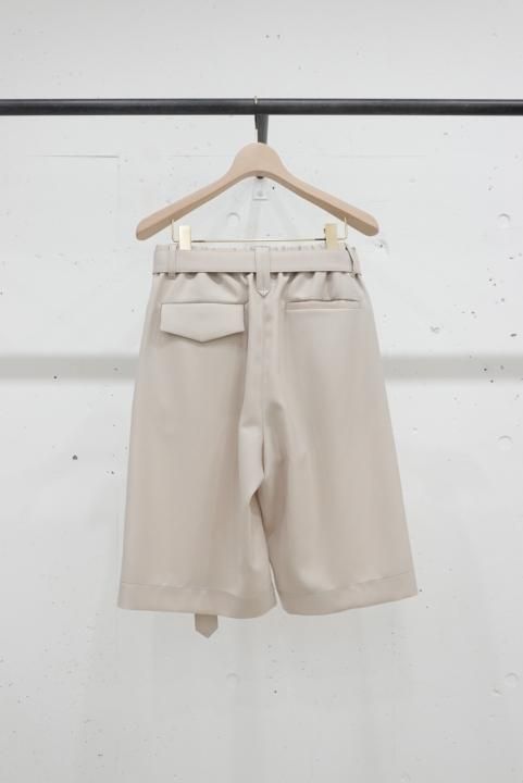 梳毛調のソフトなツイル素材を使用したタック入りショーツ。ナチュラルストレッチの素材と後ろウエストのゴム使いで着心地のよいアイテムです。ロングベルト付き。