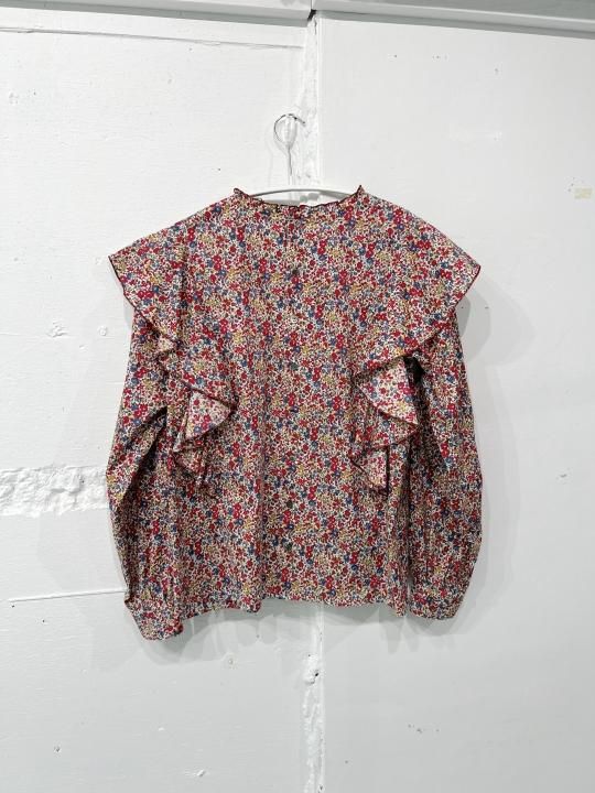 リバティ”Emma&Georgina"のレッド系を使用したフリルブラウス。