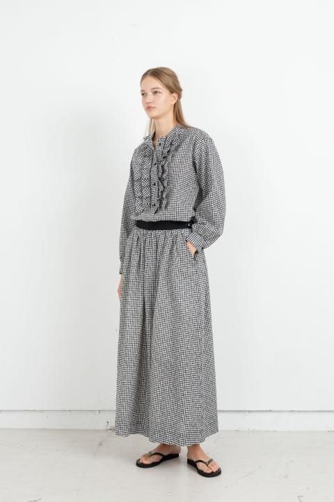 ソフトで軽く表面のシワが特徴のモノクロチェックのギャザーロングスカート。