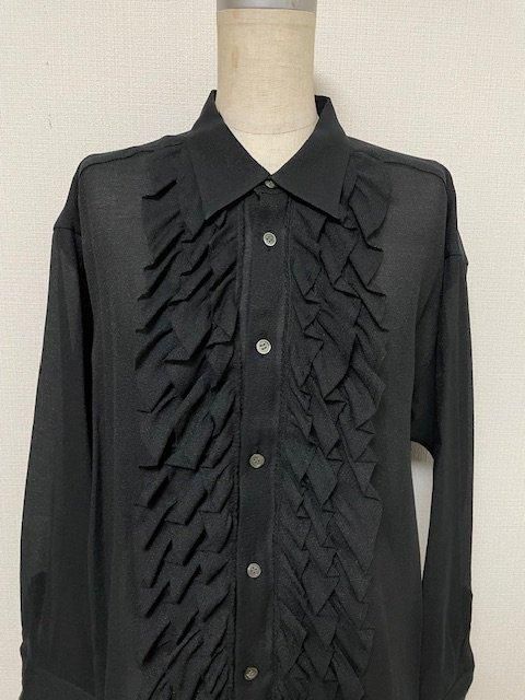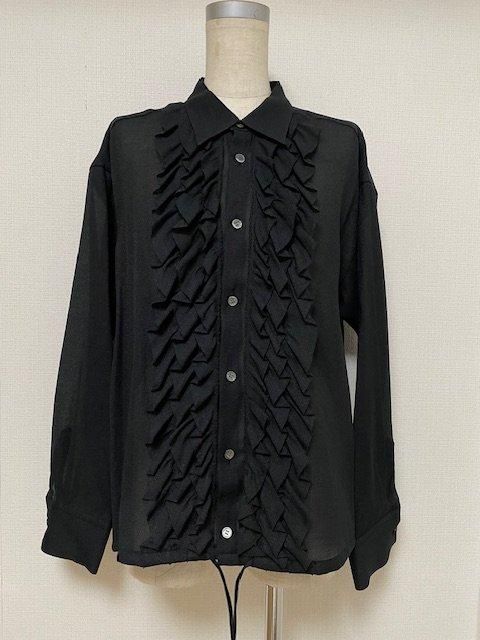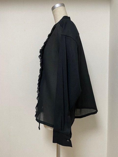 透け感のあるバーズアイ素材(凹凸感のある織柄)を用いた胸の3段のフリルがポイントのブラウス。