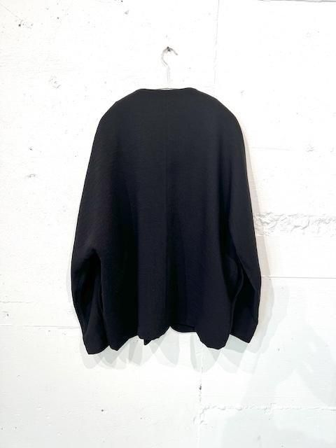 ヴィンテージ感のある特殊な織のジョーゼット地を使用したミニマルなノーカラージャケット。